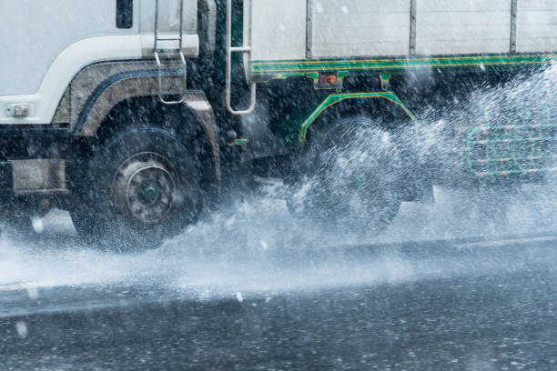 Jalan licin disertai dengan cuaca buruk akan mempersulit pergerakan truk. Gunakan lampu utama agar visibilitas meningkat.
